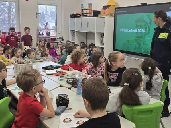 W dniu 18.02.2026 r. kolejny raz naszą szkołę odwiedzili strażnicy miejscy. Tym razem gościli w świetlicy szkolnej. Rozmawiali z uczniami klas młodszych na temat ekologii.