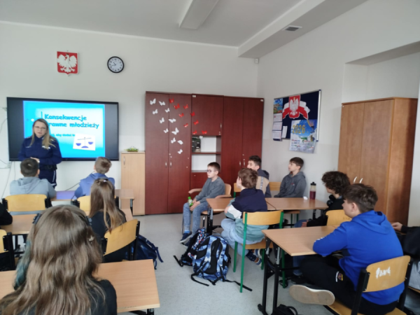 W dniu 01.04.2026r. nasza szkoła miała zaszczyt gościć aspirant policji Panią Ninę Bąk z Komisariatu Policji I w Kielcach.
