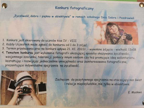 Konkurs fotograficzny "Życzliwość, dobro i piękno w obiektywie" w ramach szkolnego Dnia Dobra i Pozdrowień.
