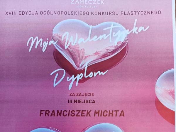 Z ogromną radością informujemy, że uczeń klasy II Franciszek Michta zdobył III miejsce w Ogólnopolskim Konkursie Moja Walentynka "Miłość jest wieczna". Rozstrzygnięcie konkursu odbyło się w DK Zameczek w Kielcach. Konkurencja była duża (około 900 prac z całej Polski), tym bardziej więc gratulujemy...