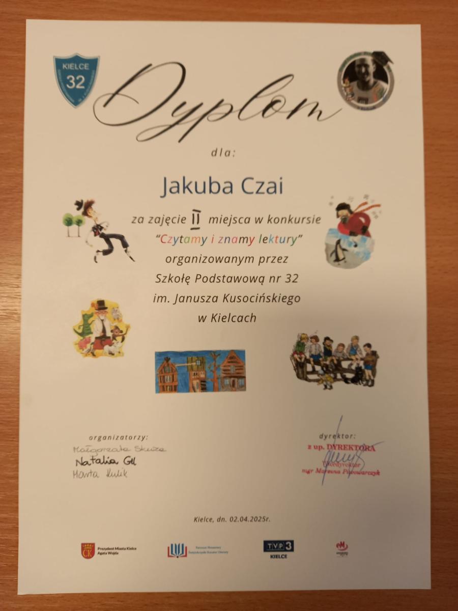 II miejsce dla Jakuba Czai w Międzyszkolnym Konkursie "Czytamy i znamy lektury"