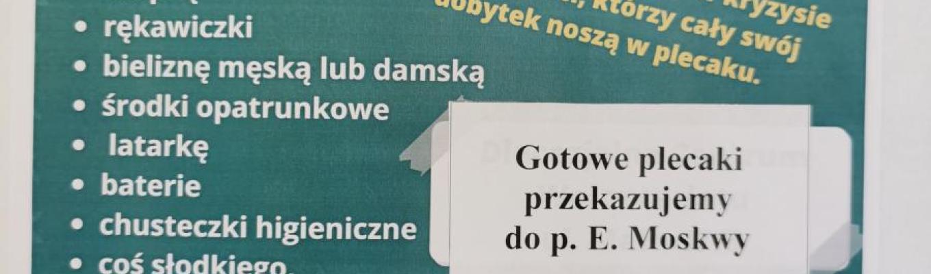 Gotowy plecak przynosimy do szkoły, (na kartce przyczepionej do plecaka piszemy - kto i z jakiej klasy przyniósł plecak oraz czy jest on dla kobiety, czy mężczyzny).