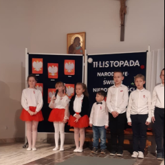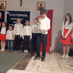 Dnia 10 listopada w naszej szkole odbyła się uroczysta akademia z okazji 11 listopada - Święta Niepodległości. W akademii udział wzięli uczniowie z klasy 7, uczniowie klasy 6, którzy tworzą szkolny Zespół Kameralny UNISONO oraz uczniowie klasy 2 i 1 uczęszczający na zajęcia świetlicowe i zajęcia szkolnego Zespołu Tanecznego CZWÓRECZKI. W programie artystycznym można było usłyszeć piękną recytację wierszy i śpiew pieśni i piosenek o tematyce patriotycznej, obejrzeć taniec z biało czerwonymi wstążkami oraz poznać historię naszego kraju świetnie ukazaną poprzez dramę. Młodzi aktorzy popisali się nie tylko talentem wokalno- tanecznych i recytatorskim, ale również plastycznym. Piękną dekorację zdobiły prace zwycięzców konkursu " Godło Polski", który odbył się w ramach zajęć świetlicowych, należą do nich: Jadwiga Majewska, Hanna Michta, Amelia Zacharska, Anastasiia Sevastijanik, Wojciech Kisiel i Filip Solnica. Po uroczystej akademii cała Społeczność Szkolna wzięła udział w akcji "Niepodległa do Hymnu" odśpiewując o godzinie 11:11 Mazurka Dąbrowskiego. Dziękujemy wszystkim zaproszonym gościom za udział w tak pięknej i doniosłej uroczystości.