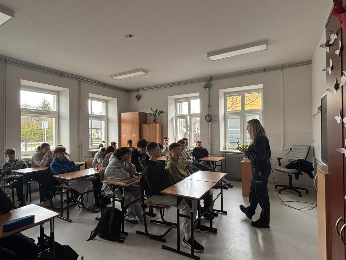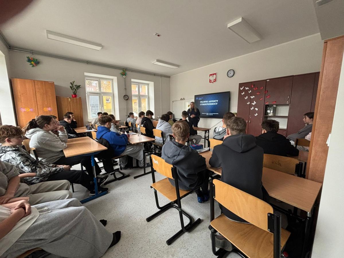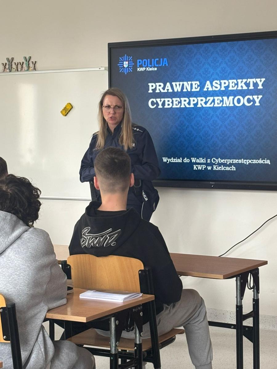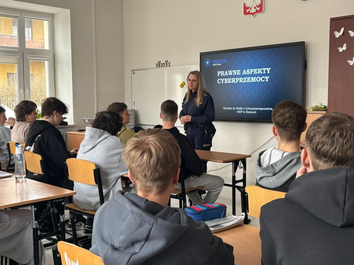 Ostatnio ponownie w naszej szkole złożyła nam wizytę pani Nina Bąk - aspirant policji Komisariatu Policji I w Kielcach, która przeprowadziła wśród uczniów klasy VII i VIII zajęcia o cyberprzemocy i konsekwencjach różnych niepożądanych działań wśród nieletnich.