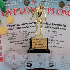 Dnia 19.03.2022r. uczeń klasy czwartej Aleksander Zagniński wziął udział w II Rundzie Ligi Pływackiej organizowanej przez Świętokrzyski Okręgowy Związek Pływacki. I po raz kolejny pokonał swoich rywali zdobywając dwa złote medale i tytuł najlepszego zawodnika wśród 11 latków.
