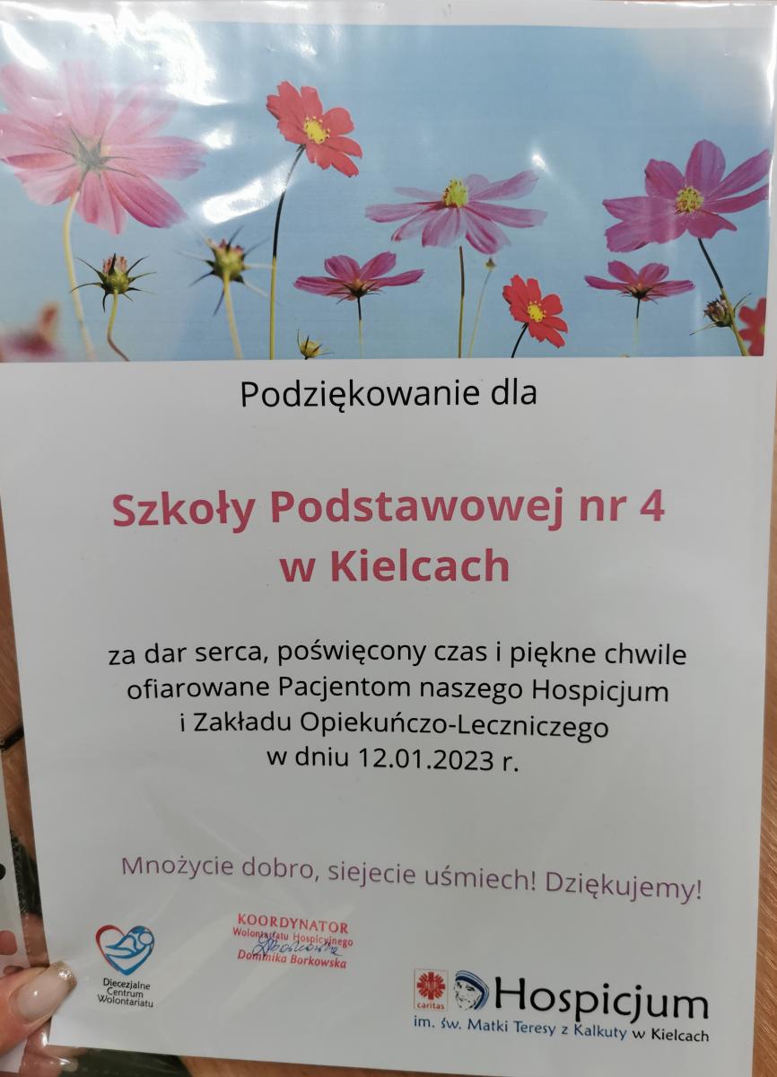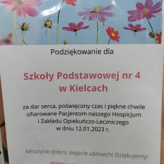Dnia 12 stycznia 2023 roku było podobnie. Szkolny Zespół Kameralny UNISONO (chłopcy z klasy V) wraz z nauczycielami odwiedzili Hospicjum Matki Teresy z Kalkuty w Kielcach.