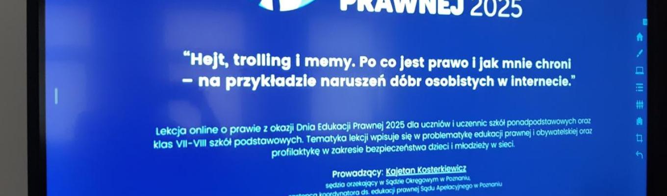 Miło nam poinformować, że nasza szkoła przystąpiła do ogólnopolskiego projektu- Dzień Edukacji Prawnej. Lekcje z prawnikami i prawniczkami. Pierwsze zajęcia poruszyły temat "Hejt,trolling i memy. Po co jest prawo i jak mnie chroni...".